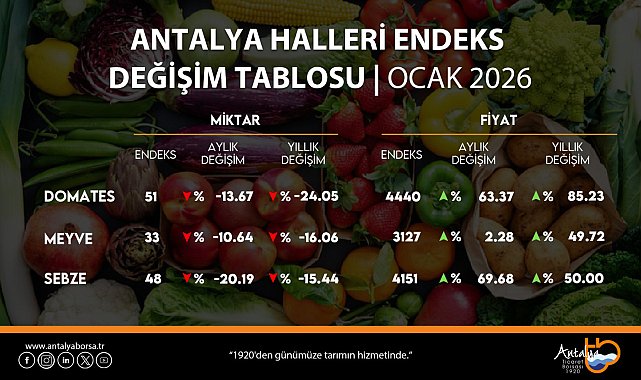 - ANTALYA Ticaret Borsası (ATB), ocak ayı hal endeksini açıkladı. Ocak ayında domates miktar endeksi yıllık yüzde 24,05 azaldı, fiyat endeksi yüzde 85,23 arttı. Meyve miktar endeksi yıllık yıllık 16,06 azaldı, fiyat endeksi yüzde 49,72 arttı. Sebze miktar endeksi yıllık yüzde 15,44 azaldı, fiyat endeksi yüzde 50 azaldı.ATB, ocak ayı hal endeksini açıkladı. Antalya hallerinde işlem gören domates, meyve ve sebze işlem miktar ve fiyatlarına ait endeks değerleri, 2026 Ocak ayında bir önceki aya ve geçen yılın aynı ayına göre değişim gösterdi. Ocak ayı miktar endeksi aylık bazda domateste yüzde 13,67, meyvede yüzde 10,64 ve sebzede yüzde 20,19 azaldı, yıllık bazda ise domateste yüzde 24,05, meyvede yüzde 16,06 ve sebzede yüzde 15,44 azaldı. Ocak ayında yıllık miktar endeksi meyve ve sebze miktar endeksi ortalama civarında, domates miktar endeksi ise ortalamanın altında gerçekleşti. Yıllık fiyat endeksi ise domates, meyve ve sebzede ortalama civarında gerçekleşti.Ocak ayında domates fiyat endeksi yıllık bazda yüzde 85,23 artarken, aynı dönemde domatesin yıllık işlem miktarı yüzde 24,05 oranında azaldı. Ocak ayında meyve fiyat endeksi yıllık bazda yüzde 49,72 artarken, aynı dönemde meyvenin yıllık işlem miktarı yüzde 16,06 oranında azaldı. Ocak ayında sebze fiyat endeksi yıllık bazda yüzde 50 arttı. Aynı dönemde sebzenin yıllık işlem miktar endeksi yüzde 15,44 oranında azaldı. Ocak ayında, son yedi yılın verileri dikkate alındığında domates, meyve ve sebze satış miktar endeksleri ortalama civarında gerçekleşti. Domates ve sebze fiyat seviyesi ortalamanın üzerinde, meyve fiyat seviyesi ortalama civarında gerçekleşti. Ocak ayında domates işlem miktar endeksi yüzde 13,67 azalırken, işlem fiyat endeksi yüzde 63,37 artış gösterdi. Son yedi yılın ocak ayları dikkate alındığında, işlem miktar endeksi dördüncü en büyük azalış; son yedi yılın ocak ayları dikkate alındığında, işlem fiyat endeksi ikinci en büyük artış olarak kaydedildi.Ocak ayında meyve işlem miktar endeksi yüzde 10,64 azalırken, işlem fiyat endeksi yüzde 2,28 artış gösterdi. Son yedi yılın ocak ayları dikkate alındığında, işlem miktar endeksi üçüncü en büyük azalış, son yedi yılın ocak ayları dikkate alındığında, işlem fiyat endeksi altıncı en büyük artış olarak kaydedildi.Ocak ayında sebze işlem miktar endeksi yüzde 20,19 azalırken, işlem fiyat endeksi yüzde 69,68 ile rekor artış gösterdi. Son yedi yılın ocak ayları dikkate alındığında, işlem miktar endeksi dördüncü en büyük azalış olarak kaydedildi.