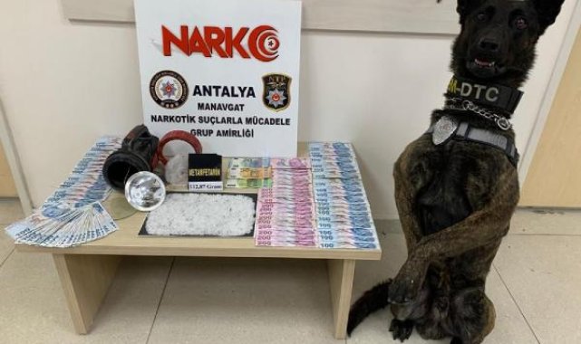 Manavgat İlçe Emniyet Müdürlüğü Narkotik Büro Amirliği ekipleri, ilçede bazı kişilerin uyuşturucu madde ticareti yaptığı bilgisi üzerine araştırma başlattı. Yapılan çalışmanın ardından B.B.'nin uyuşturucu madde ticareti yaptığı belirlendi. Polis ekipleri şüpheliyi ATV motoru ile Side Mahallesi Kemer Caddesi üzerinde yakaladı. Şüphelinin üzerinde, yanında bulunan eşyalarında ve ATV motorunun üzerinde özel eğitimli uyuşturucu madde arama köpeği Pars'ın da katıldığı arama yapıldı. Hassas burunlu dedektör köpek Pars, arama sırasında şüphelinin yanında bulunan kıyafet dolu beyaz poşet içerisinde bulunan el fenerine tepki verdi. Polis ekiplerinin kontrol ettiği el fenerinin iç kısmına gizlenmiş vaziyette ağırlığı 112,87 gram metamfetamin uyuşturucu maddesi bulundu. Şüphelinin üzerinde yapılan aramada ise uyuşturucu madde ticaretinden elde edildiği değerlendirilen 13 bin 500 lira ve 170 Euro ele geçirildi.