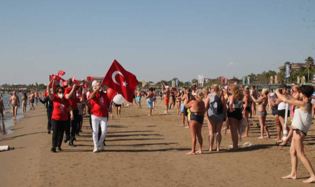 Otel bahçesinde bulunan turistlerinde katılımıyla plaja çıkan gurup sahilde yaklaşık 1 kilometrelik mesafede bando takımının çaldığı marşlar eşliğinde yürüdü. Bu sırada çevrede bulunan otellerin plajlarında güneşlenen ve denizde yüzen turistler, cep telefonları, fotoğraf makineleri ve kameralarla fotoğraf ve video çekti. Su sporları paraşütçüsünün havada Türk Bayrağı dolaştırmasıyla süren etkinliğe katılan, dağıtılan yüzlerce kırmızı beyaz balonları 10’ncı Yıl Marşı eşliğinde havaya bıraktı. Etkinlik hep birlikte çeşitli marşların söylenmesiyle sona erdi.