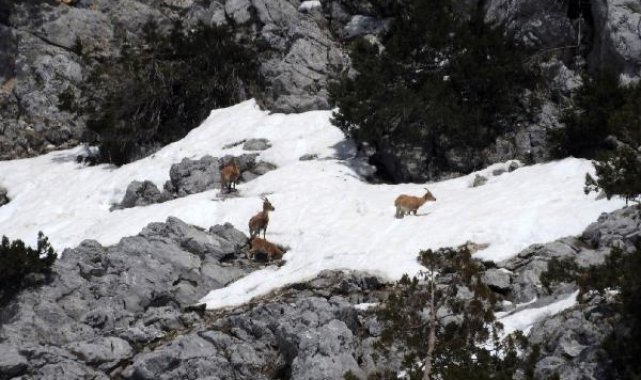 Ahmet ACAR/GÜNDOĞMUŞ, (DHA) - ANTALYA'nın Gündoğmuş ilçesi yaylalarında, nesli tükenme tehlikesi altında olduğu için koruma altına alınan ve avlanması yasak olan olan dağ keçileri, karlı ve sarp kayalıklarda beslenirken fotoğraflandı.Dünya Doğa Koruma Birliği'nin yayınladığı kırmızı listede nesli tükenme tehlikesi altındaki türler arasında yer alan yaban keçileri, Gündoğmuş ilçesinde fotoğraflandı. Gündoğmuş yaylalarındaki sarp kayalıklarda yaşamını sürdüren dağa keçileri, karlı tepelerde otlarken görüntülendi. Dağ keçileri, bölgedeki ardıç, sedir gibi ağaçların yapraklarını yiyerek beslenmesini sürdürüyor.Dağ keçilerini fotoğraflayan Aykut Yarar, "Doğa gezilerinde, dağ keçilerine rastladım. Sarp dağlarda geziyorlar. Onlara yaklaşmak çok zor. Dağ keçileri koruma altında ve avlanması yasak. Doğadaki bu güzellik, 3- 5 kilo et için yok edilmemeli" dedi.FOTOĞRAFLI