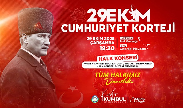 SERİK Belediyesi, Cumhuriyetin 102. yılını Cumhuriyet korteji ve halk konseriyle kutlayacak.Serik Belediyesi tarafından düzenlenecek 29 Ekim Cumhuriyet Bayramı kutlamaları Atatürk Anıtı'nın önünde gerçekleştirilecek programla başlayıp, akşam Hal Kavşağı'ndan başlayacak kortej yürüyüşüyle devam edecek ve Çınaraltı Meydanı'nda son bulacak. Belediye yetkilileri korteje tüm vatandaşları bayraklarıyla katılmaya davet etti. Kortejin ardından saat 20.30'da Çınaraltı Meydanı'nda düzenlenecek halk konseriyle kutlamalar devam edecek. Serik Belediye Başkanı Kadir Kumbul, "Tüm halkımızı, Cumhuriyet'in coşkusunu hep birlikte yaşamaya davet ediyorum" dedi.