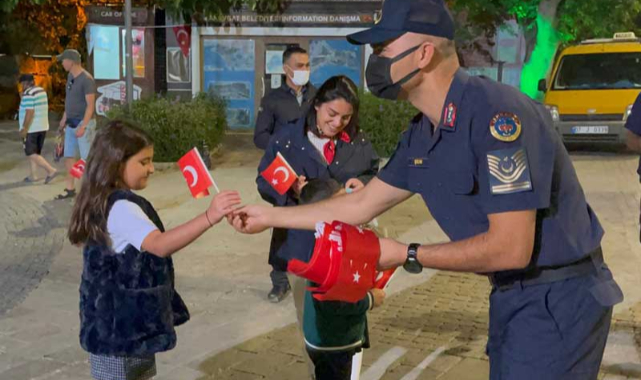 Manavgat’ın dünyaca ünlü Side Mahallesi’nde jandarma tarafından 29 Ekim Cumhuriyet Bayramı’nda yerli ve yabancı turistlere Türk bayrağı dağıtıldı.