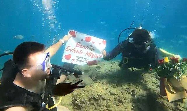 ANTALYA'nın Alanya ilçesinde Muhammet Akbıyık (28) uzun süre birlikte olduğu Ezgi Uysal'a (28) tüple dalış yaptıkları denizde sürpriz evlilik teklifi yaptı. Teklifine 'Evet' cevabı alan Muhammet Akbıyık, deniz altında Uysal'a yüzük taktı.Kentte restoran müdürü olarak görev yapan Muhammet Akbıyık, uzun süre birlikte olduğu Ezgi Uysal'a sürpriz evlilik teklifi planladı. Çift, Okurcalar Mahallesi'ndeki dalış okulunun eğitmenleri eşliğinde denize tüplü dalış yaptı. Bu sırada Akbıyık, önceden hazırladığı 'Benimle evlenir misin' yazısının yer aldığı kağıdı açıp Uysal'a evlilik tekli yaptı. Teklifinin kabul edilmesinin ardından Akbıyık, Uysal'a yüzük taktı. Çiftin mutlu anları su altı kamerasıyla kaydedildi.